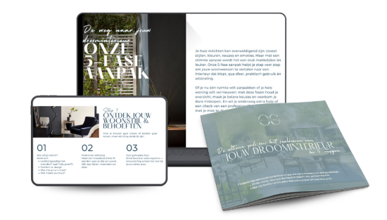 Jouw droominterieur in 5 stappen is een toegankelijke online gids, samengesteld door een interieurprofessional, die je stap voor stap begeleidt naar een samenhangend en tijdloos interieur. Geen stress, geen miskopen, geen eindeloze zoektochten: in vijf heldere stappen leer je hoe je keuzes maakt die bij jou passen en jarenlang mee kunnen.